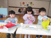 出来た魚を海に見立てたブルーシートに「いってらっしゃい!」と魚を置きました。