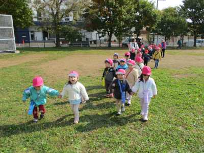 「今日はどんぐり拾いに行くよ!」の掛け声で歩いて、NHKグラウンドまでどんぐりを拾いに行きました。