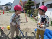 園友会から寄贈された新しい砂場セットを使って、楽しくお店屋さんごっこなどを