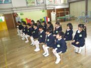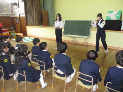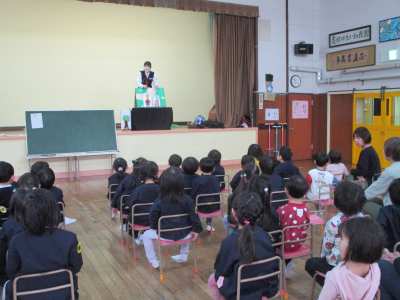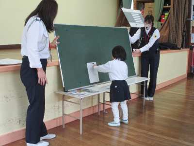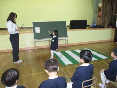 年長さんにとっては、幼稚園生活最後の教室だったので、代表のお友だちが横断歩道の渡り方を行い、修了証書を受け取りました。年長さんは小学生になったら、こぐまクラブで学んだことを思い出し、頑張って学校まで歩いていこうね。
