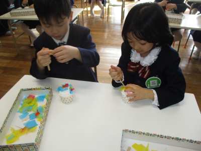 前日に切っておいた花紙を紙粘土にぷすぷすと刺してブーケを作りましたよ!