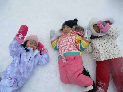 雪だるまを作りたくて元々あった丸い雪をさらに転がしたり、追いかけっこをしたり、小さい坂を滑ったり、「雪のお布団みたい」と寝てみたり…。お友だちや先生と雪遊びを楽しみました。