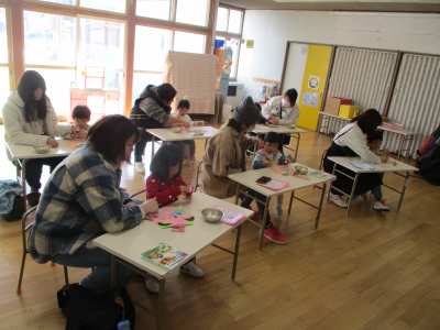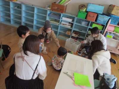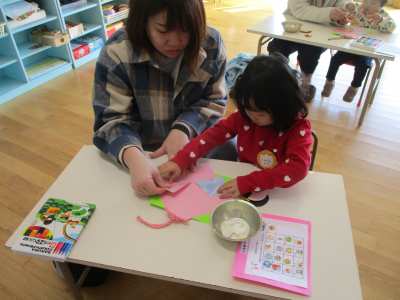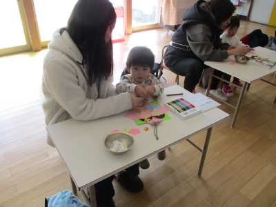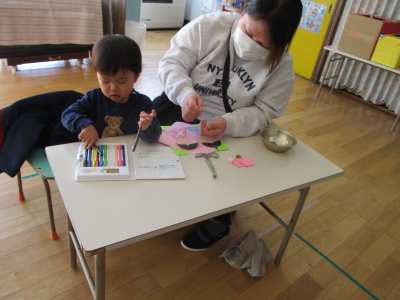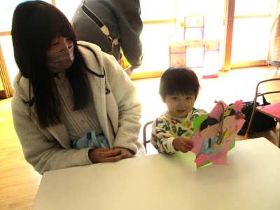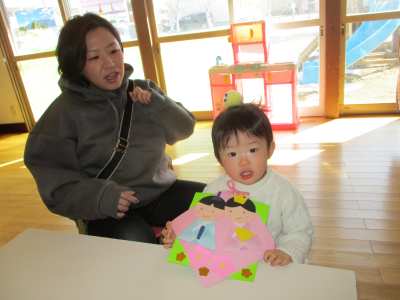 紙芝居「おひなさまがうまれたよ」を読んで、みんなで「ひなまつり製作」をしました。